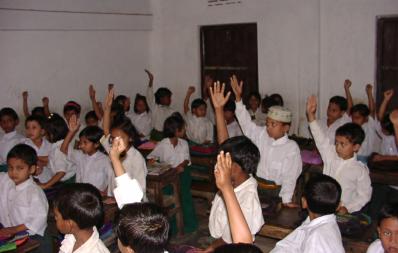 A government classroom - the upraised hands are children who previously